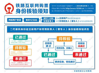 身份信息核驗狀態(tài)為“已通過”、“預通過”的注冊用戶和常用聯系人,可在12306網站正常辦理購票業(yè)務;其他狀態(tài)的注冊用戶和常用聯系人需要確認在12306網站所填信息的正確性,或持相關證件原件到車站窗口或代售點辦理身份信息核驗。12306網站提示“身份信息重復”的注冊用戶,用戶本人(不可代辦)須持在網站注冊時填寫的有效身份證件原件,到車站售票窗口辦理。